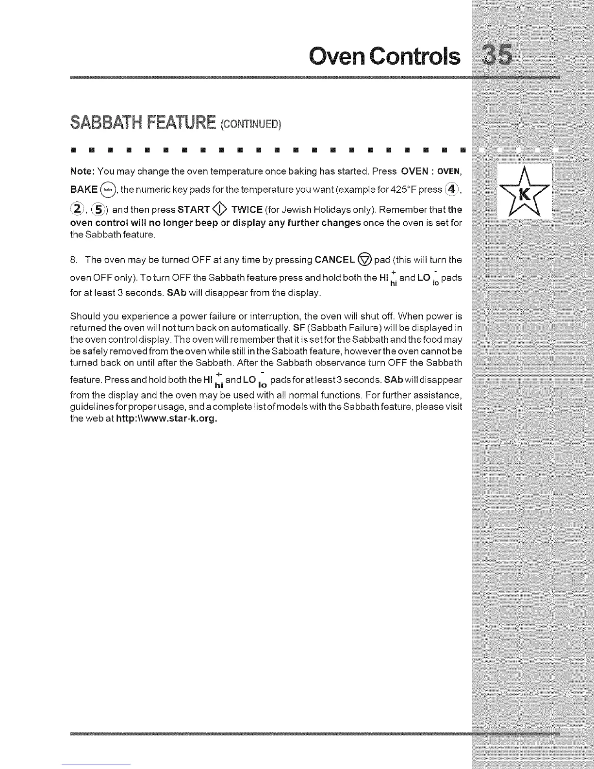 oven OFF only). To turn OFF the Sabbath feature press and hold both the HI h+iand LO Iopads