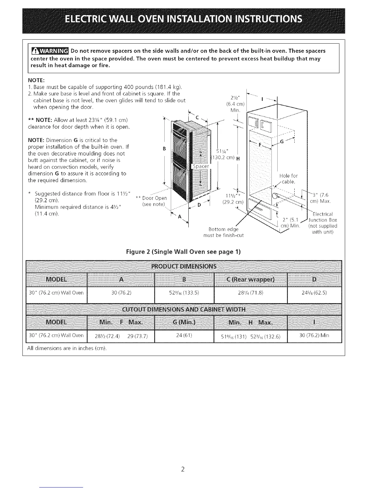 30" (76.2 cm) Wall Oven 28Y2 (72.4) 29(73.7) 24(61) 519/1G(131) 523/16(132.6) 30 (76.2) Min