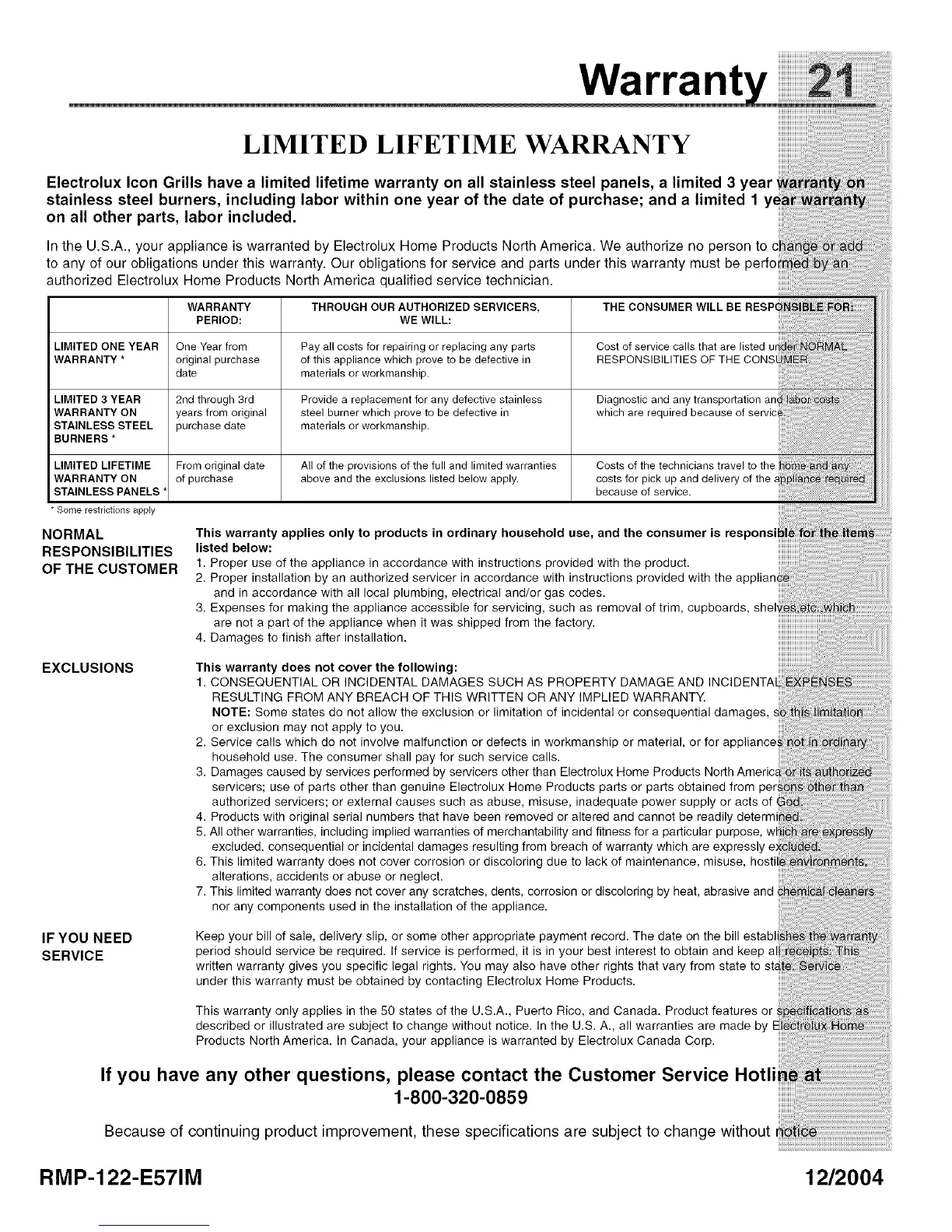 under this warranty must be obtained by contacting Electrolux Home Products.
