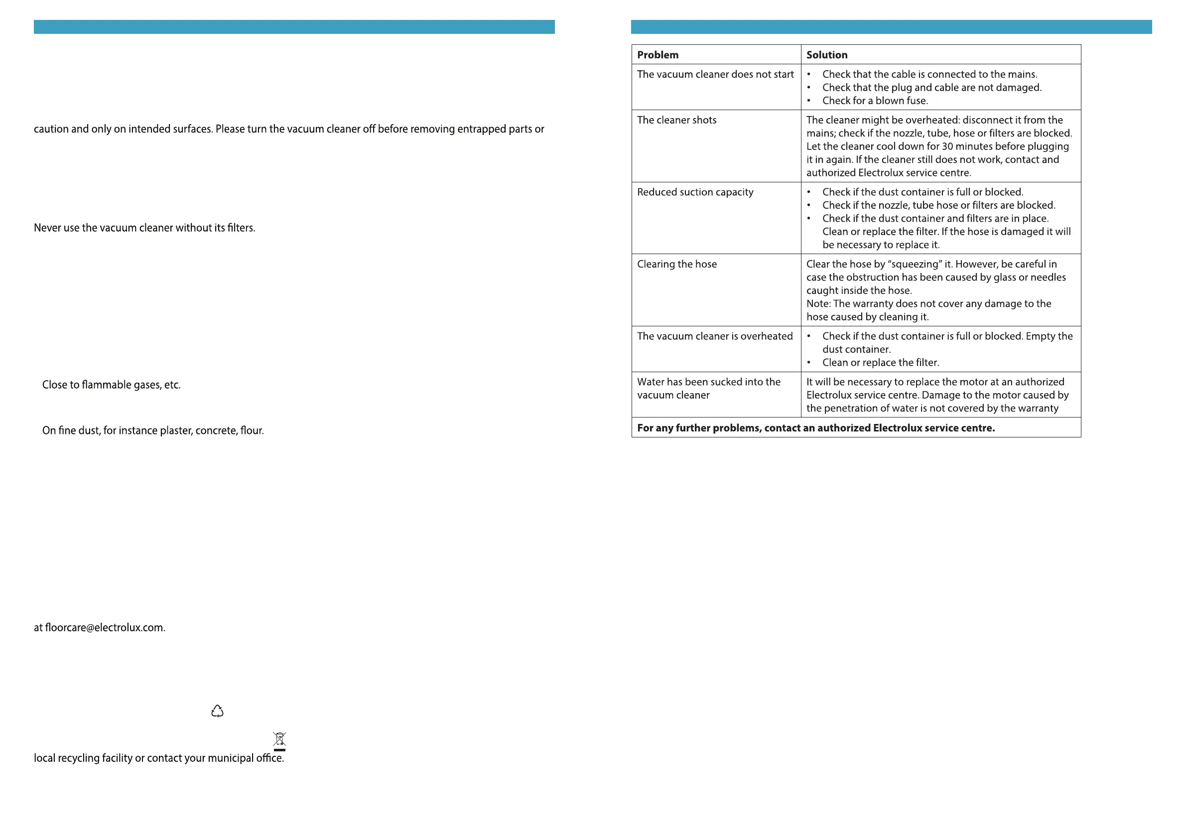 • If the cord is damaged, it must be replaced only by an authorized Electrolux service centre in order to avoid a