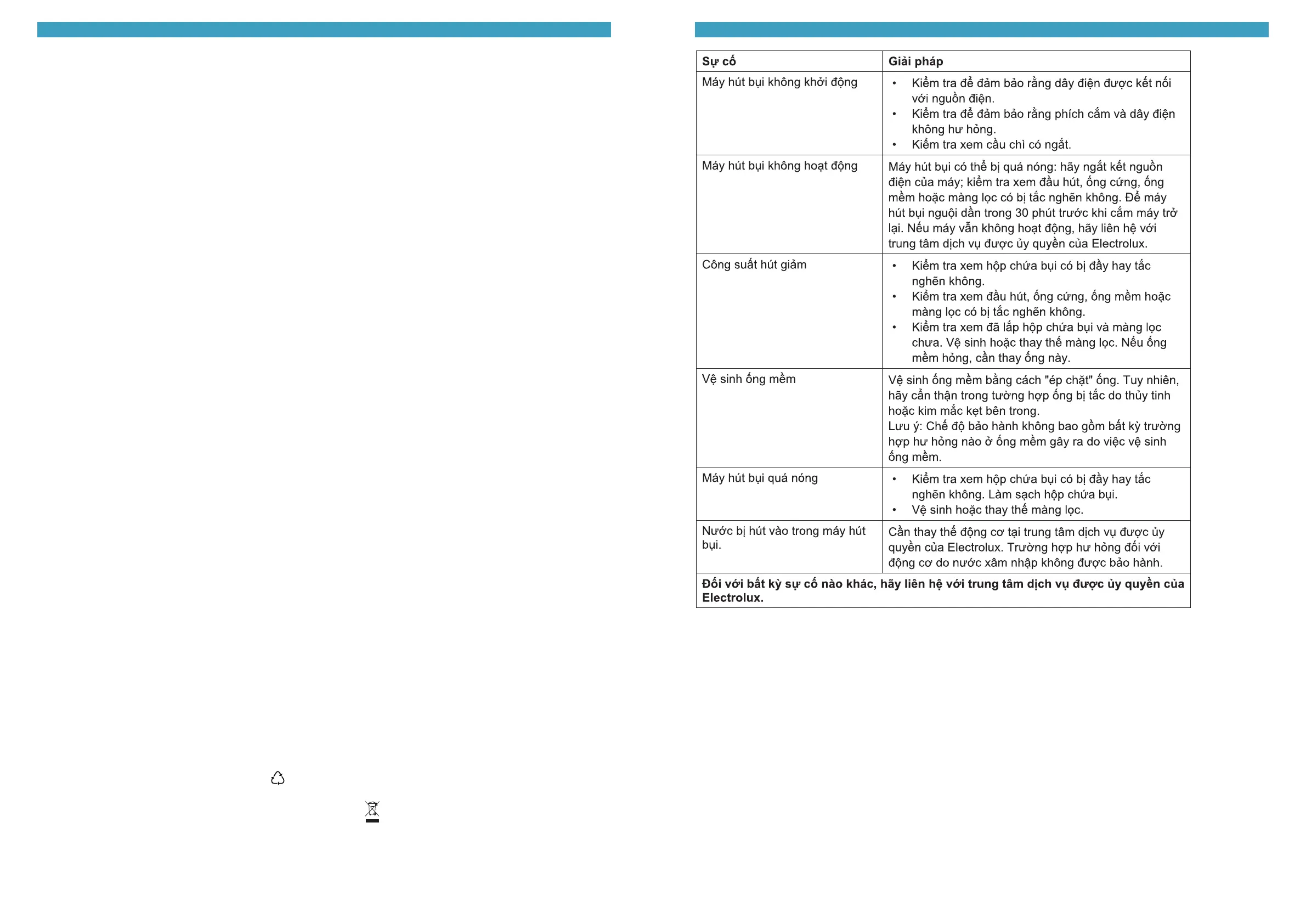 Mọi việc bảo dưỡng và sửa chữa phải do trung tâm dịch vụ được ủy quyền của Electrolux thực hiện.