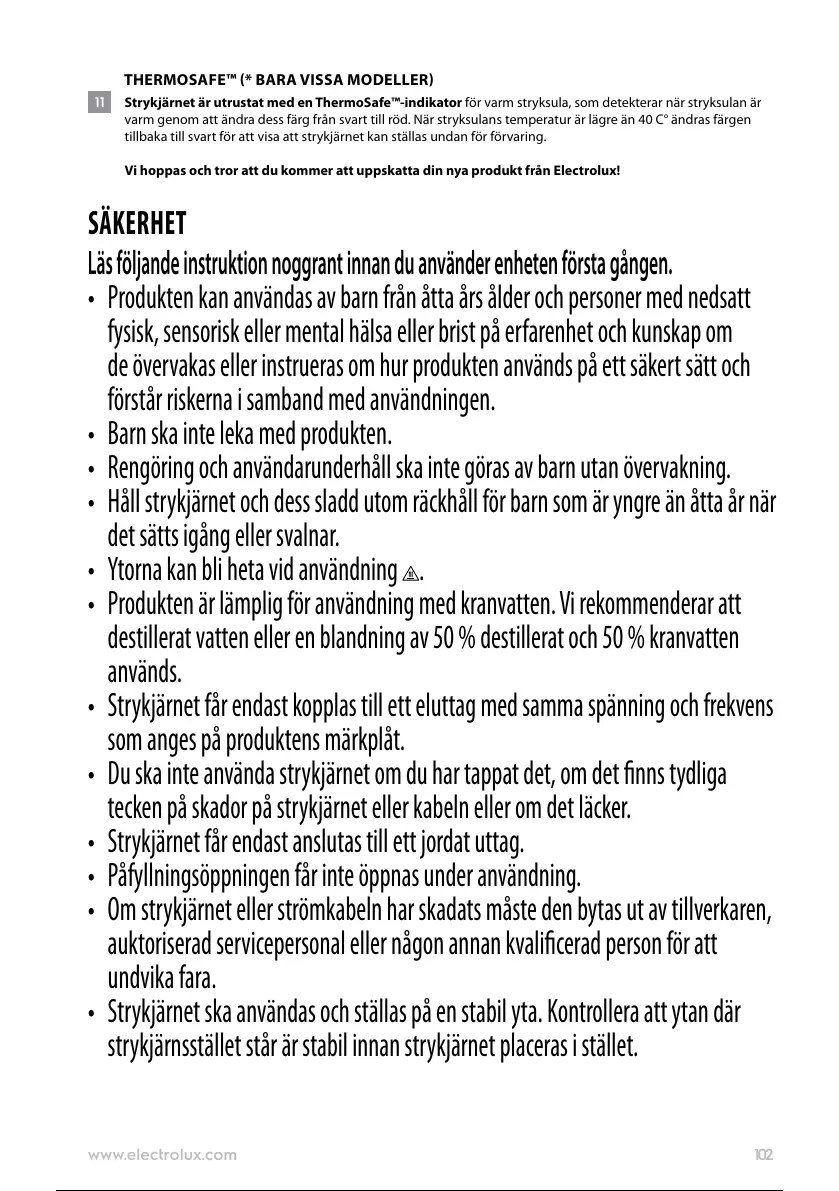 • Håll strykjärnet och dess sladd utom räckhåll för barn som är yngre än åtta år när