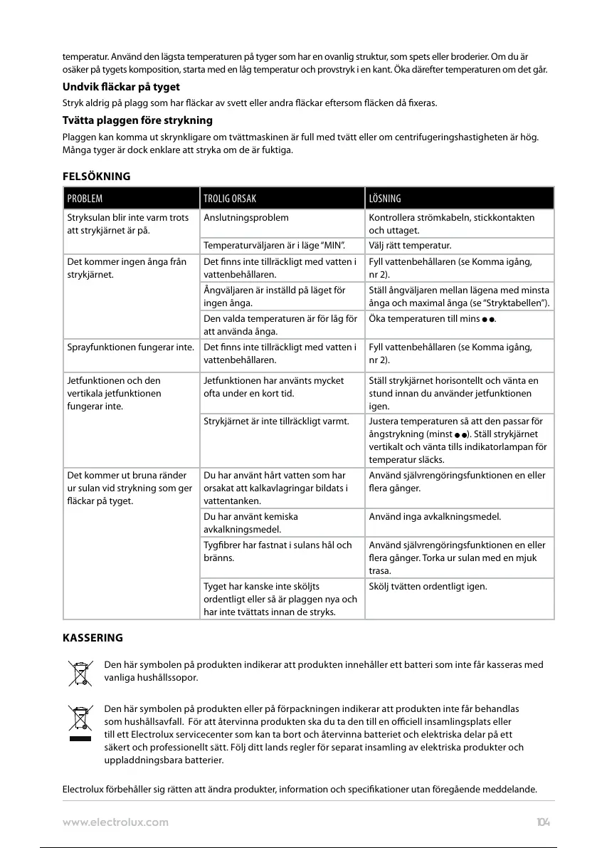 till ett Electrolux servicecenter som kan ta bort och återvinna batteriet och elektriska delar på ett