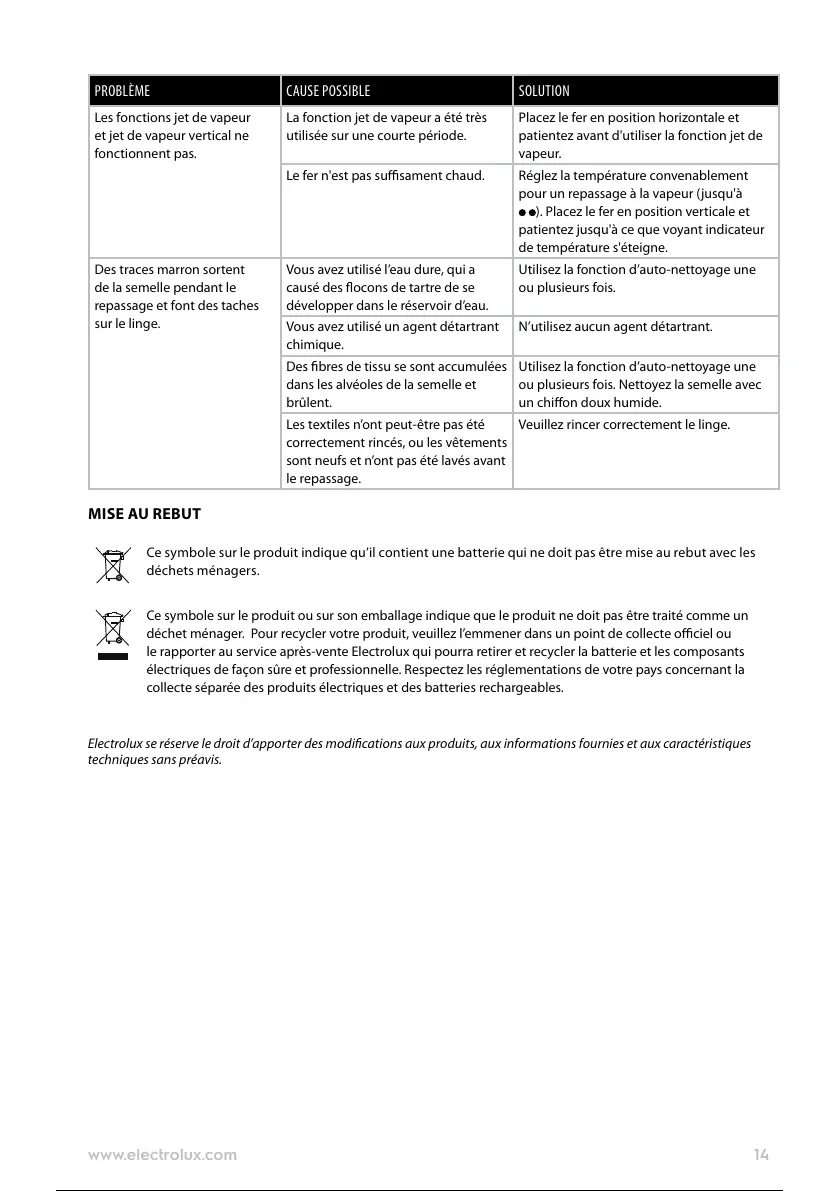 le rapporter au service après-vente Electrolux qui pourra retirer et recycler la batterie et les composants