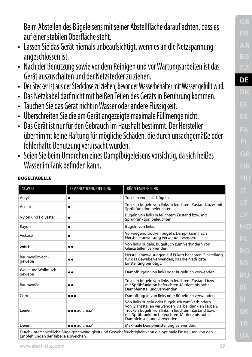 GEWEBE TEMPERATUREINSTELLUNG BÜGELEMPFEHLUNG