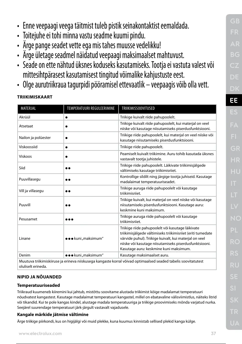 Muutuva triikimiskiiruse ja erineva niiskusega kangaste korral võivad optimaalsed seaded tabelis soovitatutest