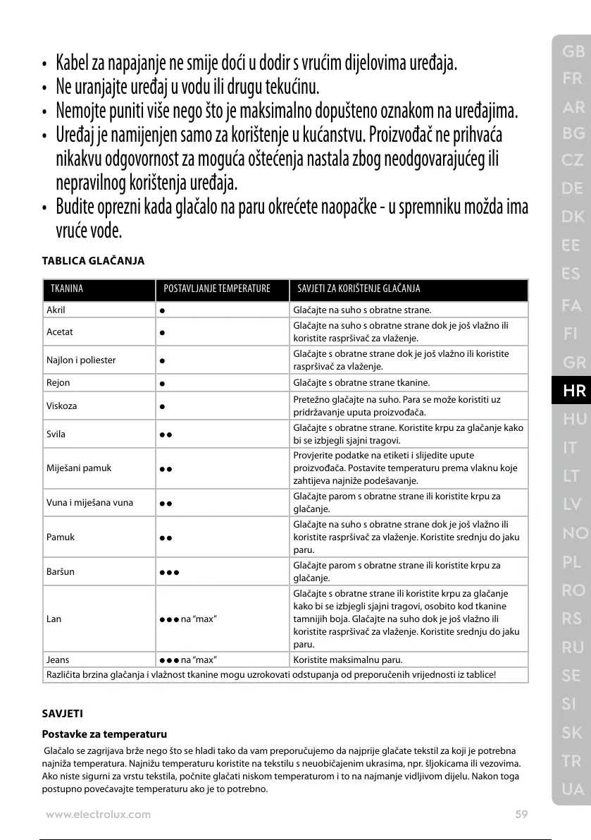 Različita brzina glačanja i vlažnost tkanine mogu uzrokovati odstupanja od preporučenih vrijednosti iz tablice!