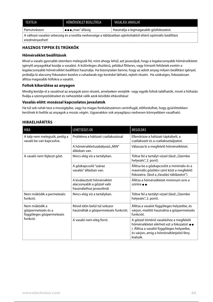 Mindig kerülje el a vasalóval az anyagok azon részeit, amelyeken verejték- vagy egyéb foltok találhatók, mivel a hőhatás
