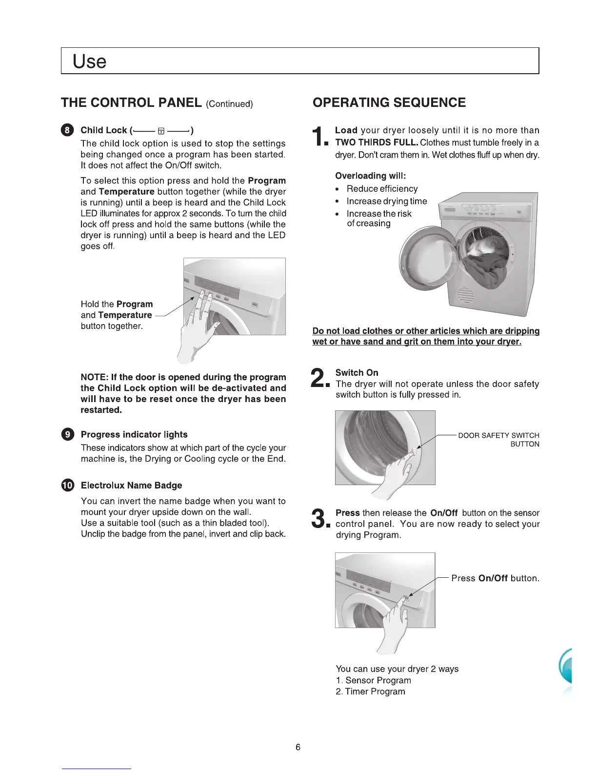 Electrolux EDV505 - Operating Sequence; Control Panel Features