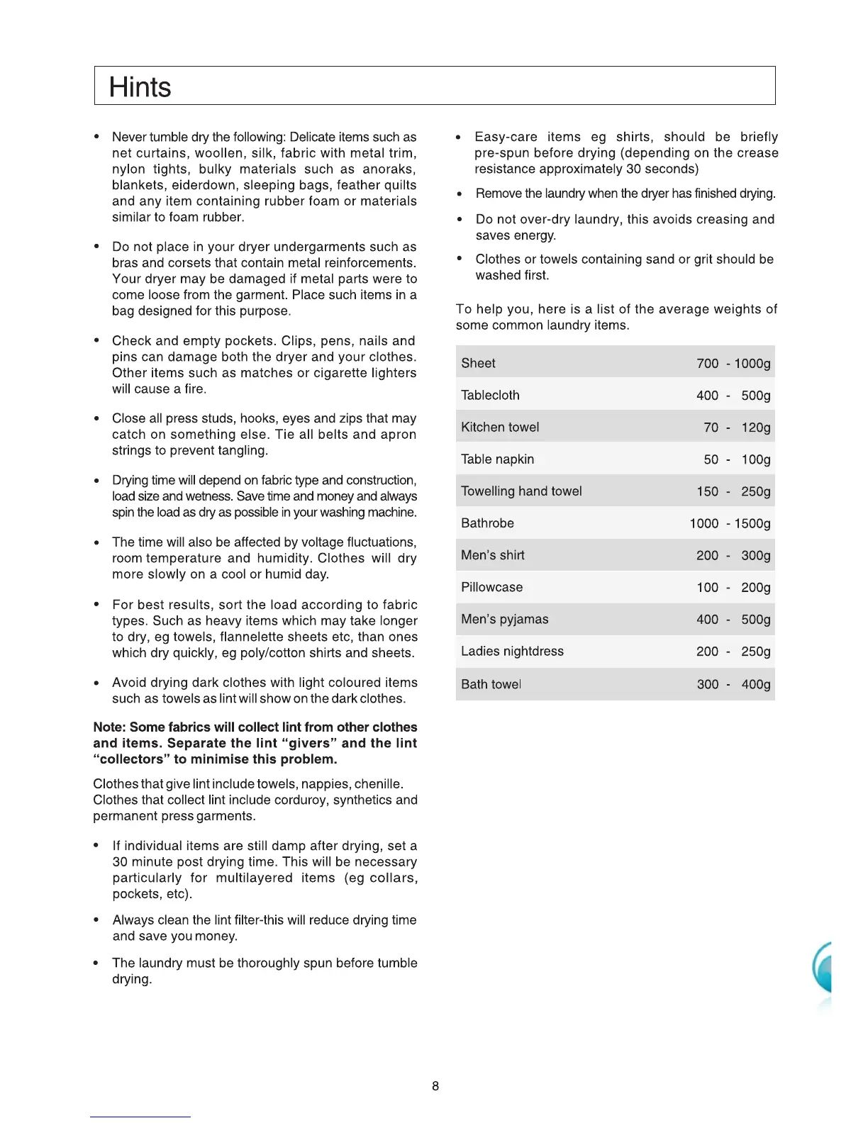 Electrolux EDV505 - Hints; Laundry Weight Guide