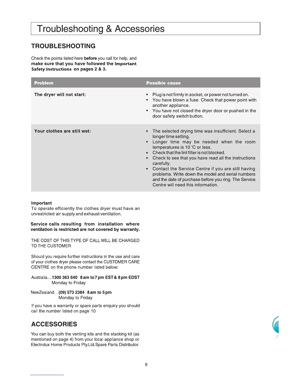 Electrolux EDV505 - Troubleshooting & Accessories; Troubleshooting; Accessories