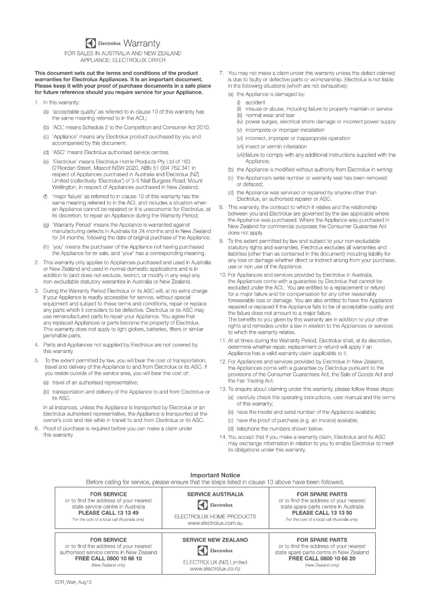 Electrolux EDV5051 - Electrolux Warranty Information; Warranty Terms and Conditions; Service and Spare Parts Contacts
