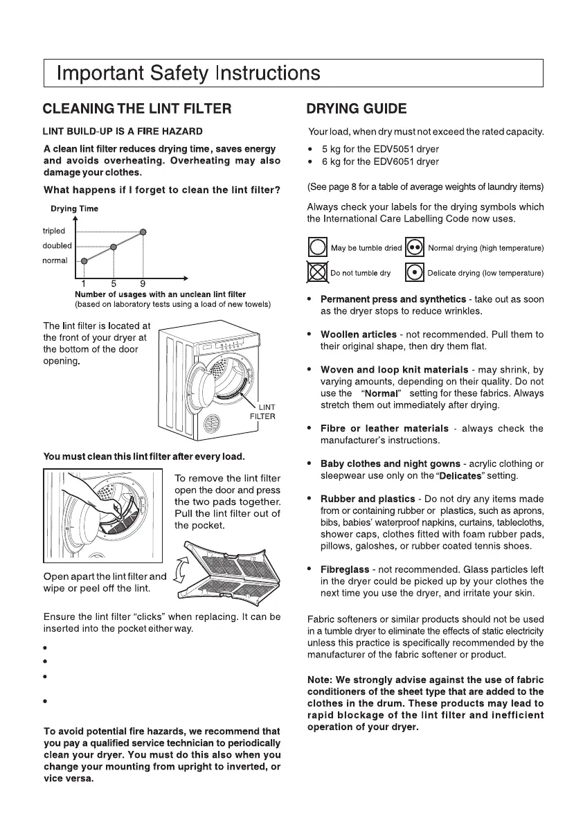 Electrolux EDV5051 - Cleaning the Lint Filter; Drying Guide