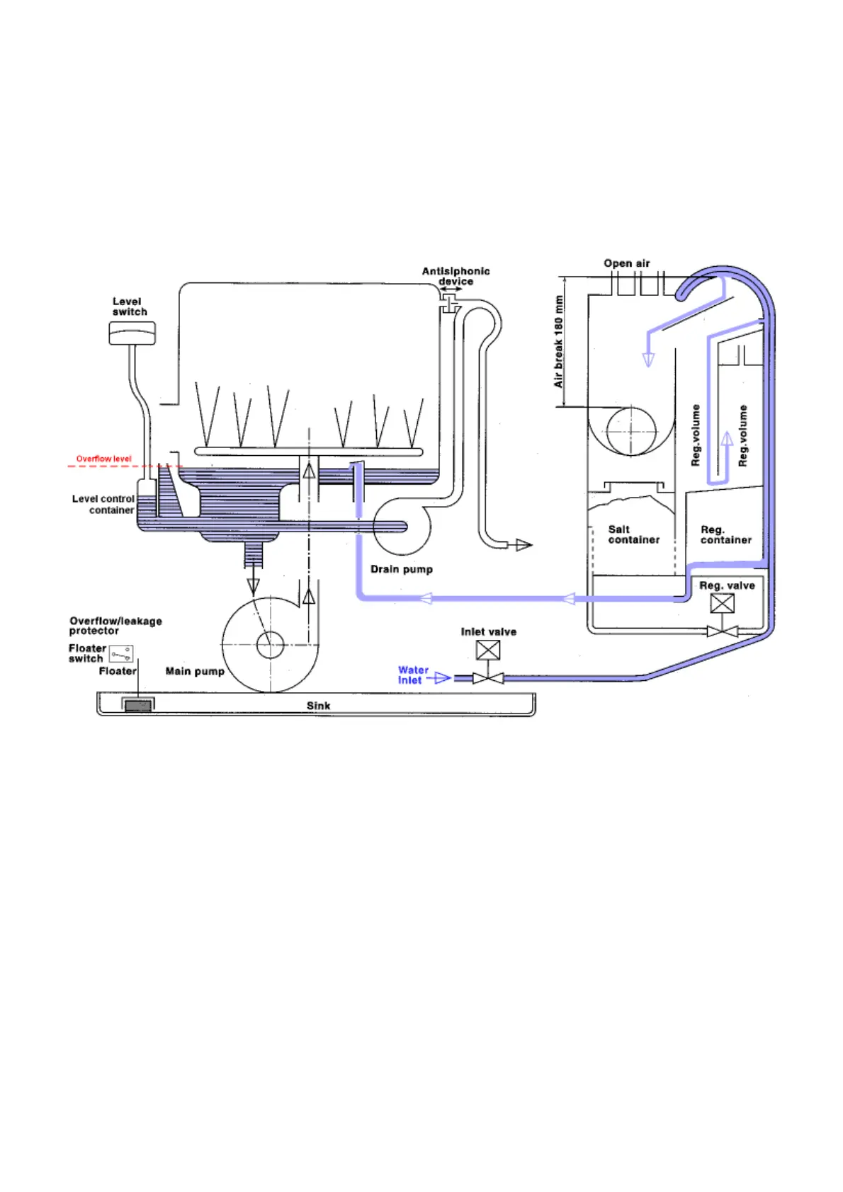 The water flows into the regeneration dosage chamber via inlet valve, over air break, into