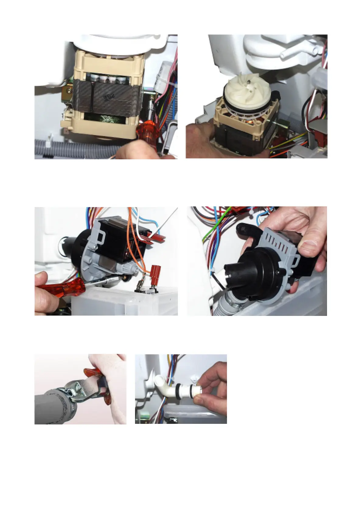 To dismount the drain pump, the hose clamps are released and the screws removed.