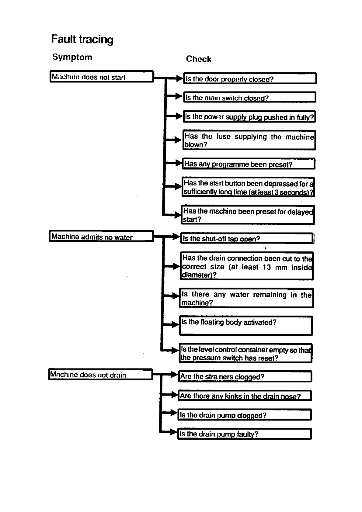 Electrolux EDW 503 - Fault Tracing: Machine Start Issues; Fault Tracing: Water Inlet Problems; Fault Tracing: Drainage Issues
