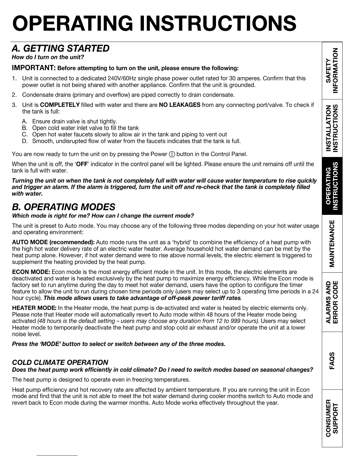 Electrolux EE66WP30PS - Operating Modes; Cold Climate Operation; Audo Mode;Econ Mode; Heater Mode