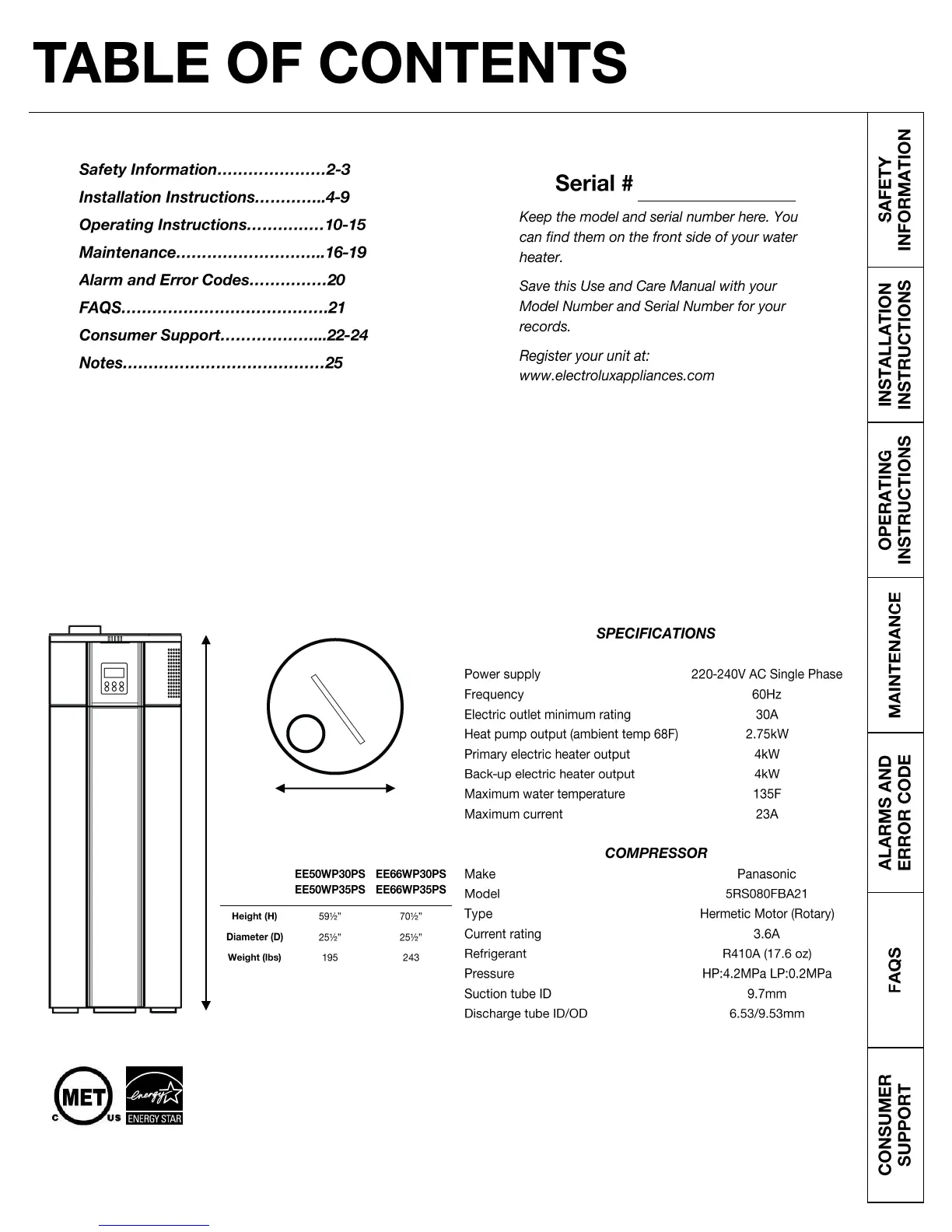 Electrolux EE66WP30PS - Table of Contents; Specifications
