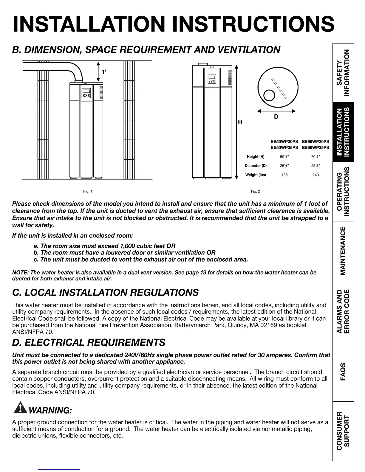 Electrolux EE66WP30PS - Dimension, Space Requirements and Ventilation; Local Installation Regulations; Electrical Requirements