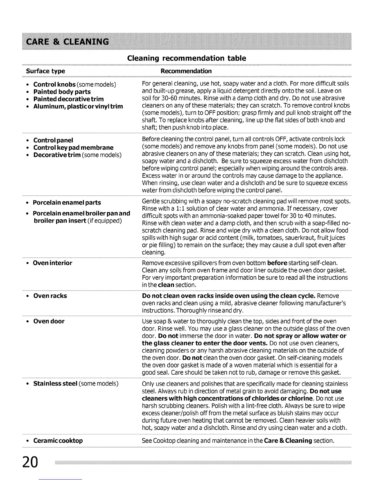 • Porcelain enamel parts Gentle scrubbing with a soapy no-scratch cleaning pad will remove most spots.