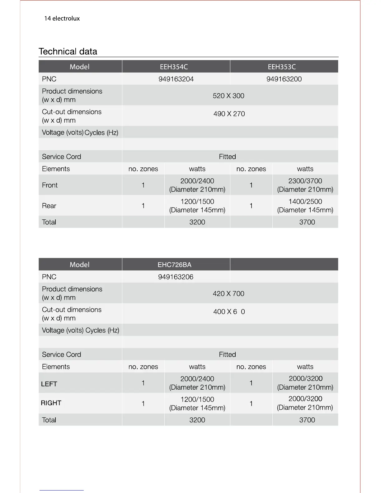 Electrolux EEH353C - Technical Data