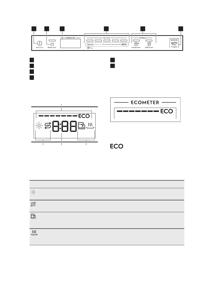 Rinse aid indicator. It is on when the rinse aid dispenser needs refill‐