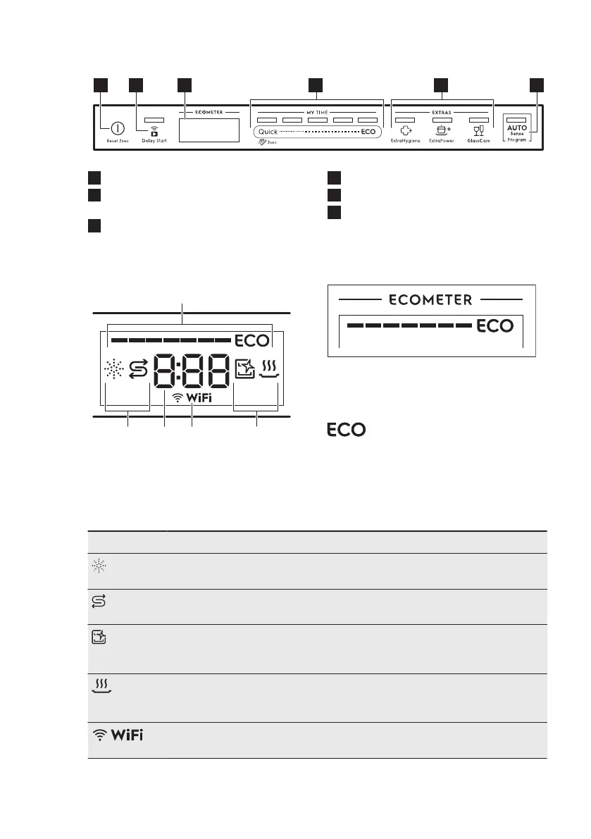 Rinse aid indicator. It is on when the rinse aid dispenser needs refill‐