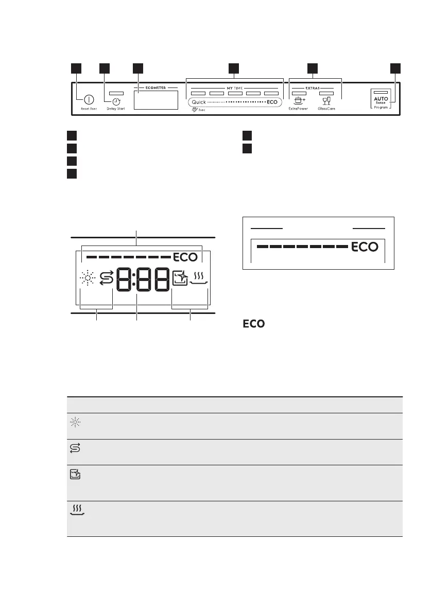 Rinse aid indicator. It is on when the rinse aid dispenser needs refill‐