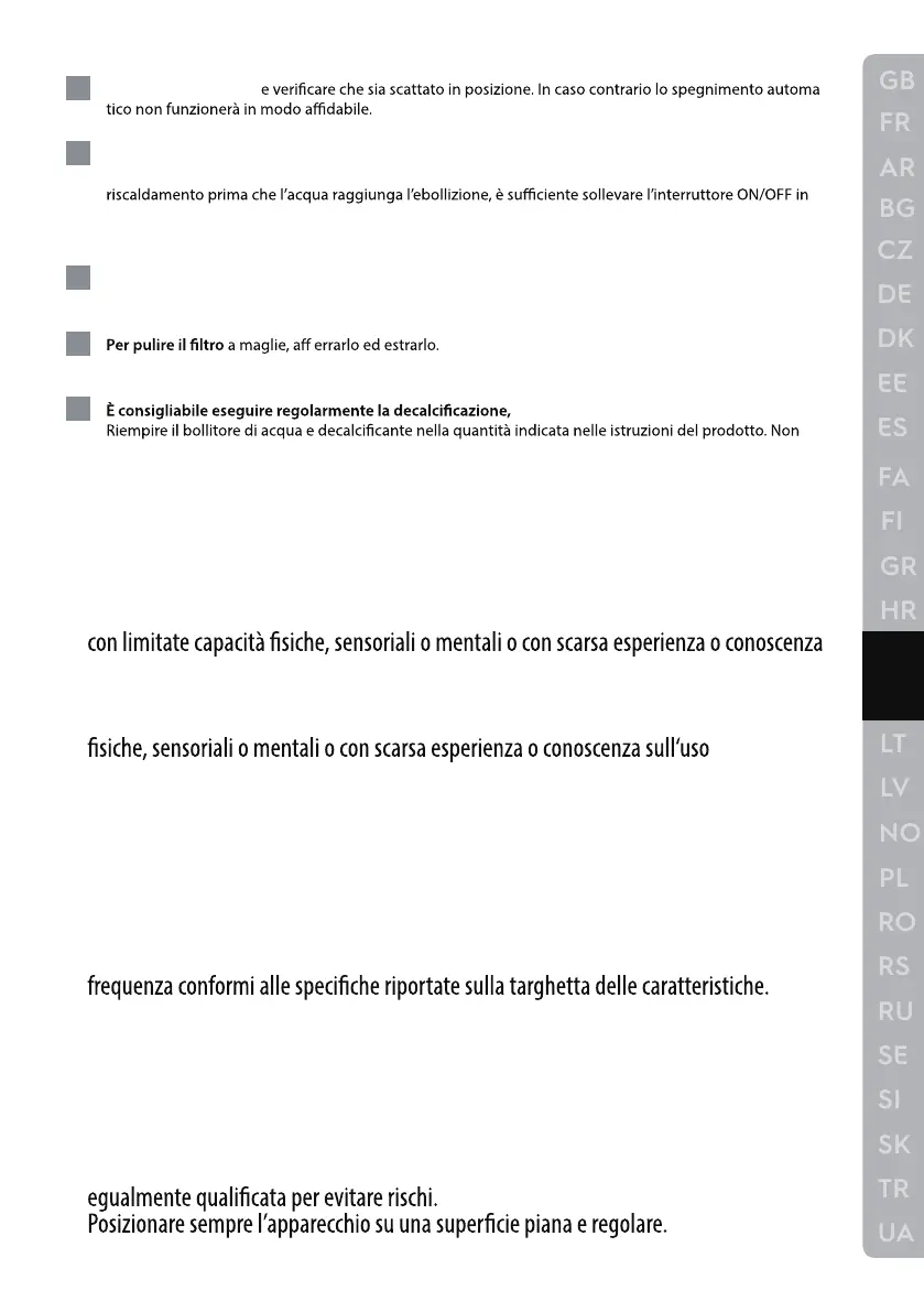 6 Scollegare sempre l’apparecchio prima procedere alla pulizia. Non sciacquare o immergere il bollitore