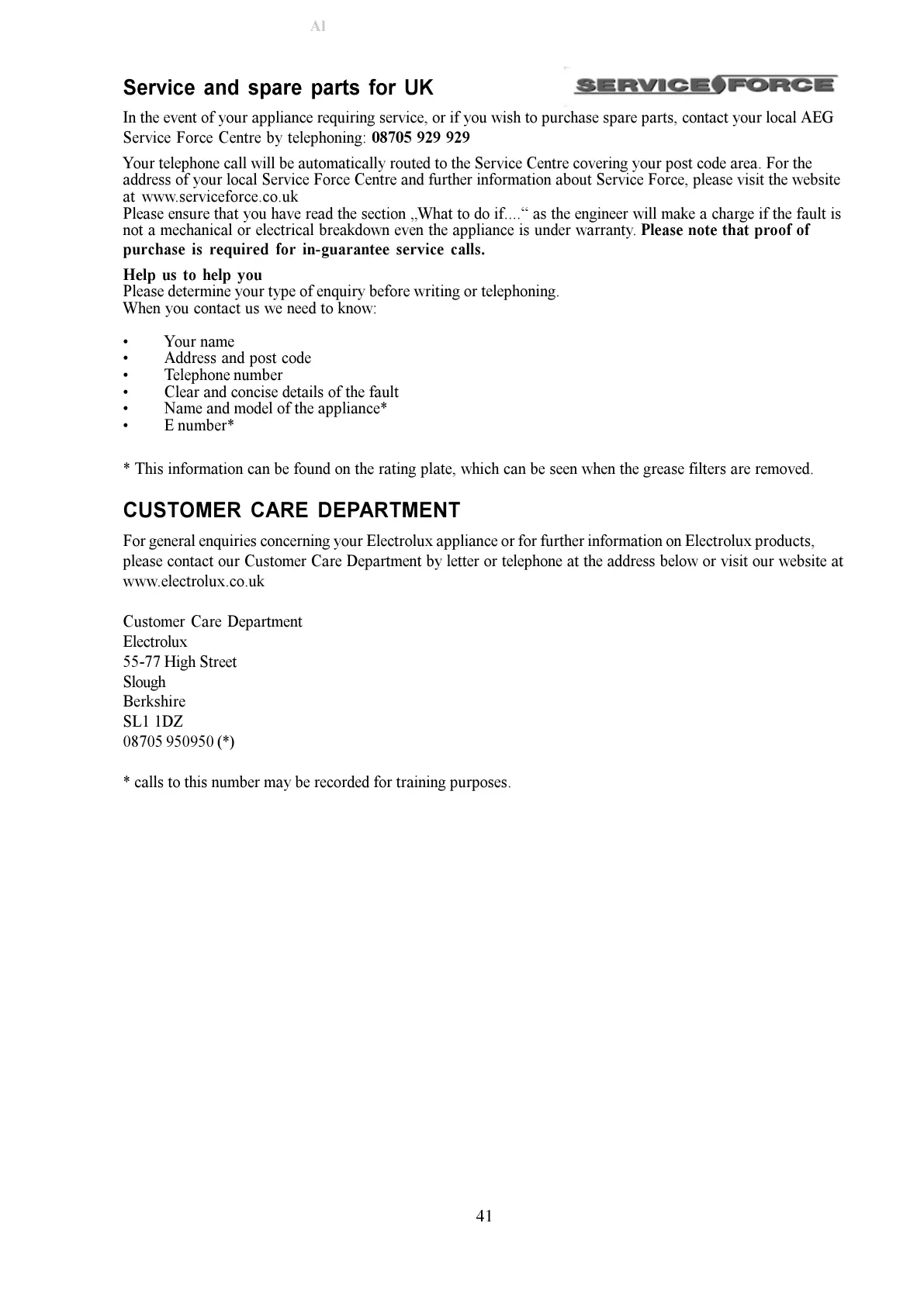 In the event of your appliance requiring service, or if you wish to purchase spare parts, contact your local AEG