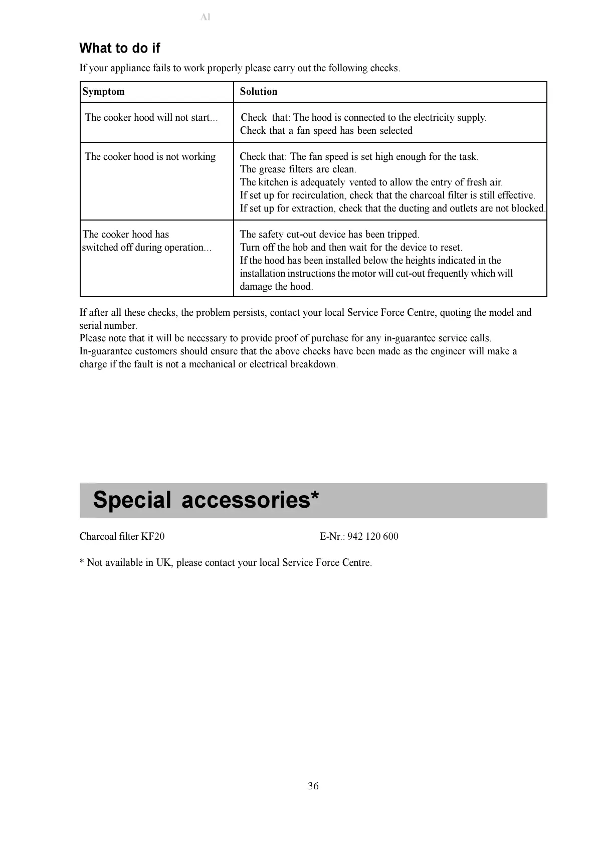 The cooker hood will not start... Check that: The hood is connected to the electricity supply.