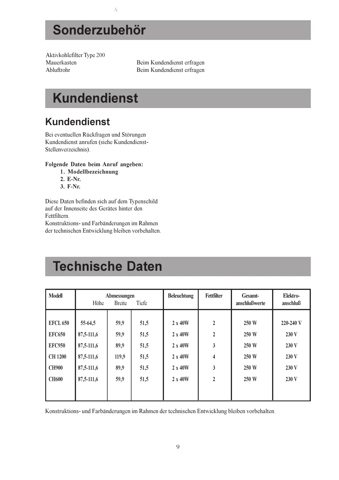 Modell Abmessungen Beleuchtung Fettfilter Gesamt- Elektro-