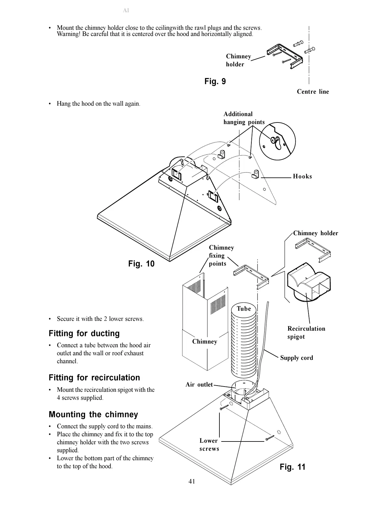 Mount the chimney holder close to the ceilingwith the rawl plugs and the screws.