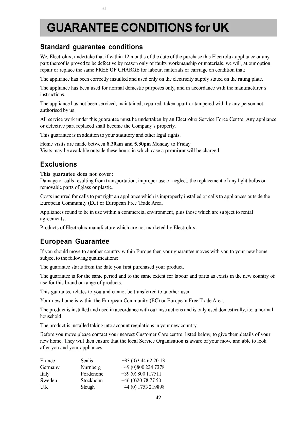 All service work under this guarantee must be undertaken by an Electrolux Service Force Centre. Any appliance