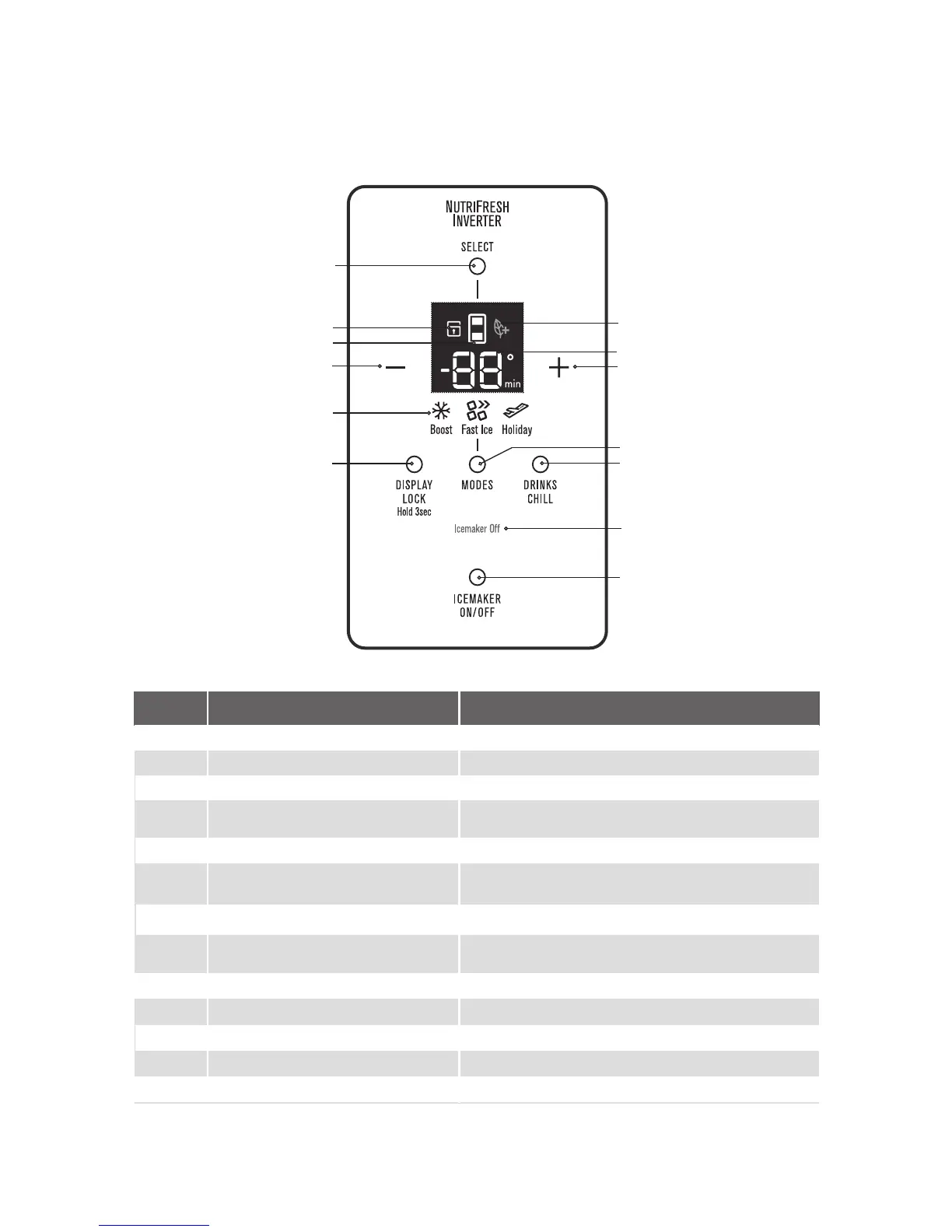 7 Indikator modus (Naikkan, Es Cepat, Libur) Menunjukkan modus pengoperasian lemari es.