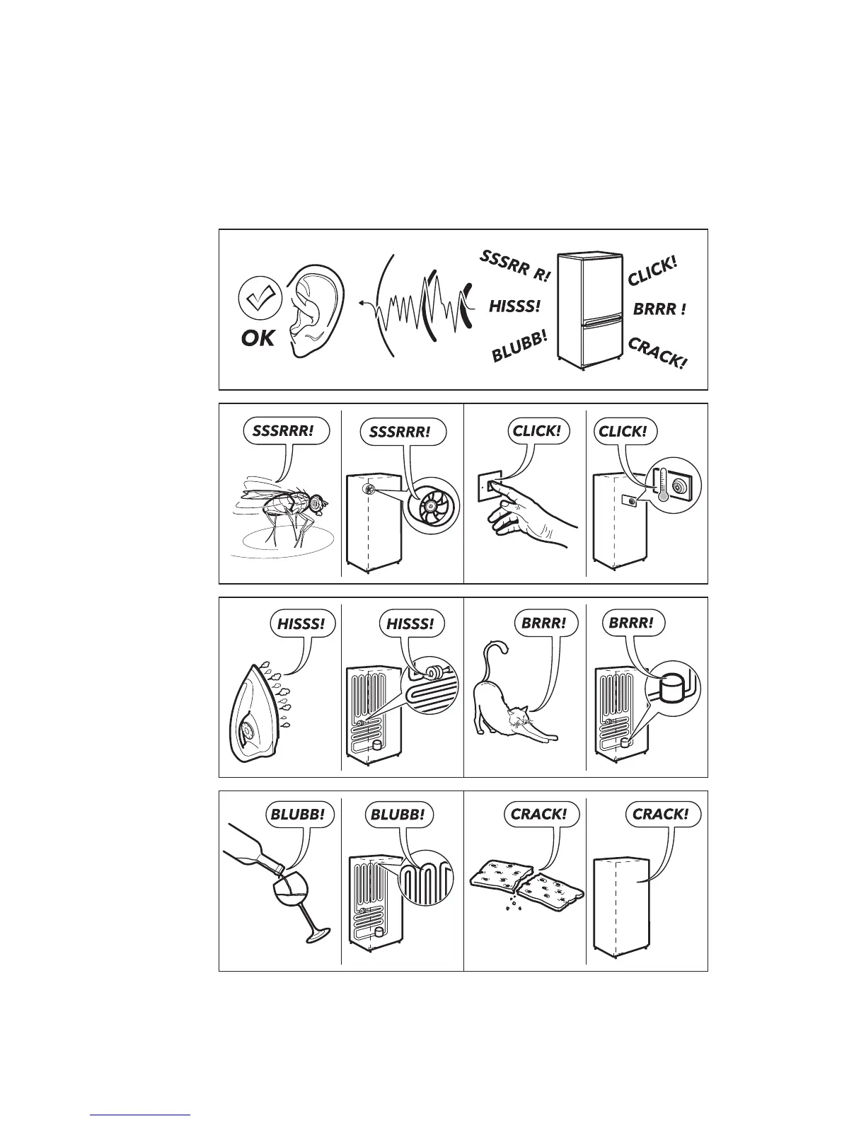 ตู้เย็นใหม่ของคุณอาจทำให้เกิดเสียงที่ไม่มีในตู้เย็นเครื่องเก่าของคุณ เนื่องคุณไม่คุ้นเคยกับเสียง คุณอาจกังวลเกี่ยวกับเสียงเหล่านี้ เสียงส่วนใหญ่เป็นเรื่องปกติ
