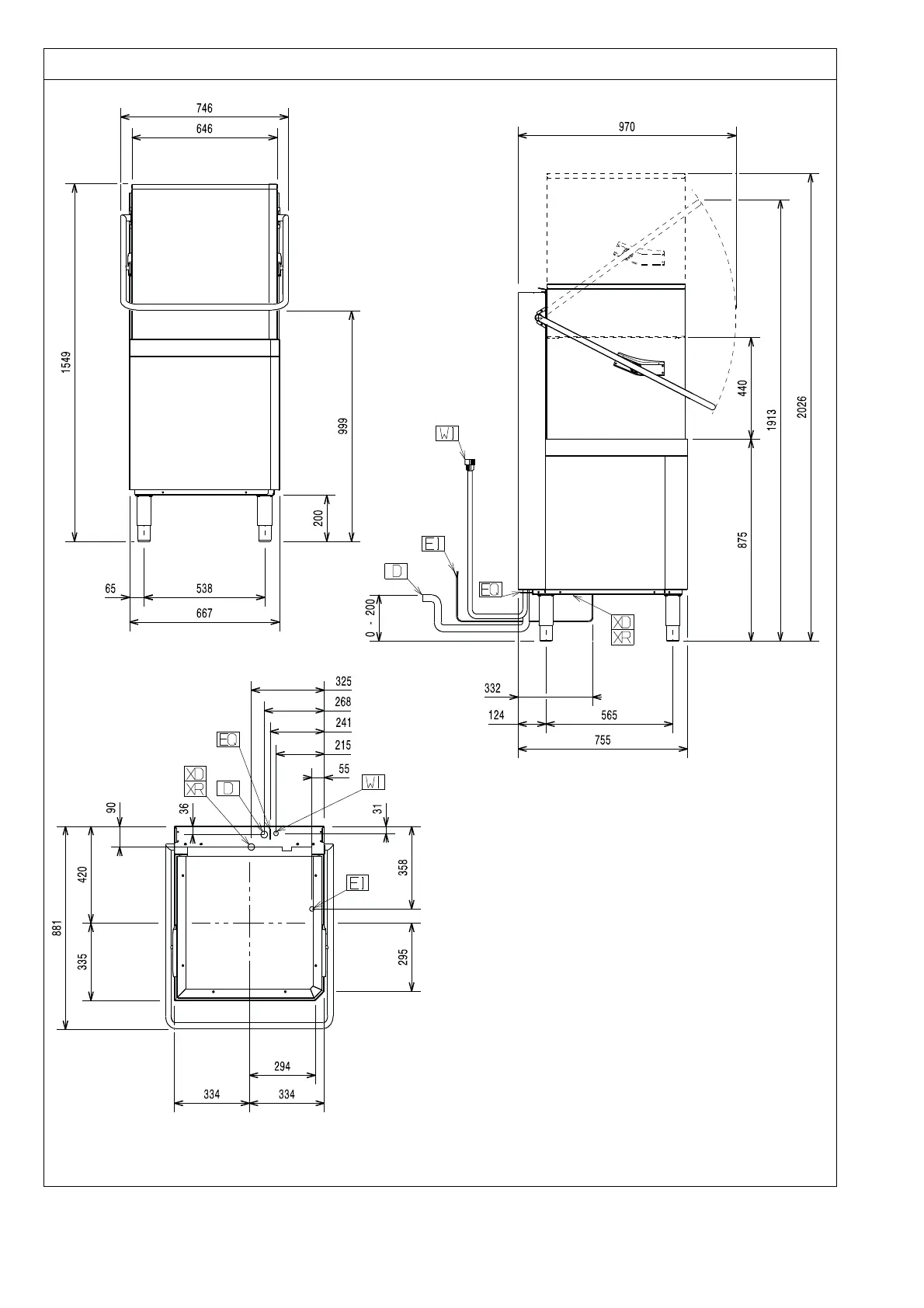 Installation diagram - manual hood type (single skin) without drain pump and without energy saving device (ESD)