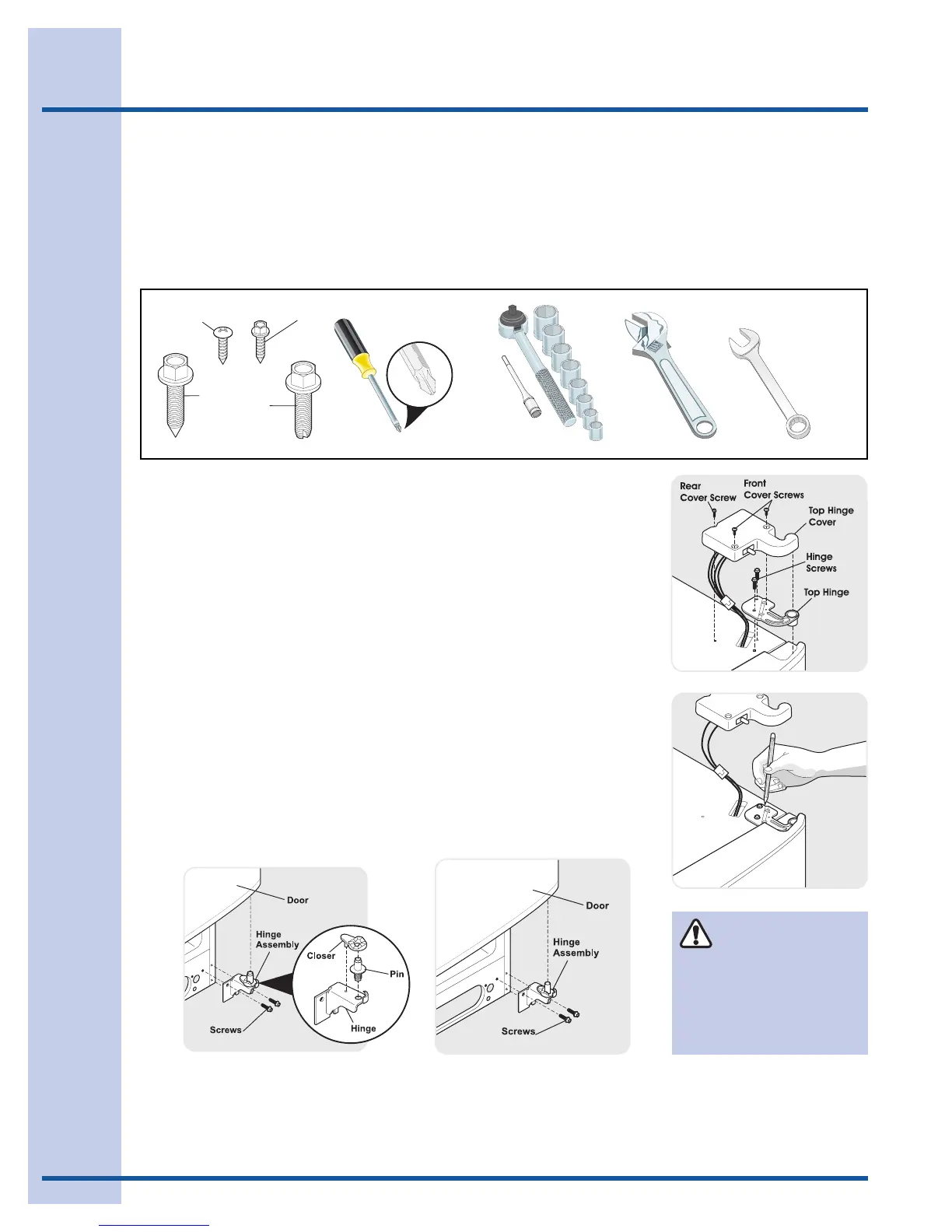 2 Remove the two screws from the top hinge. Lift the door off of the