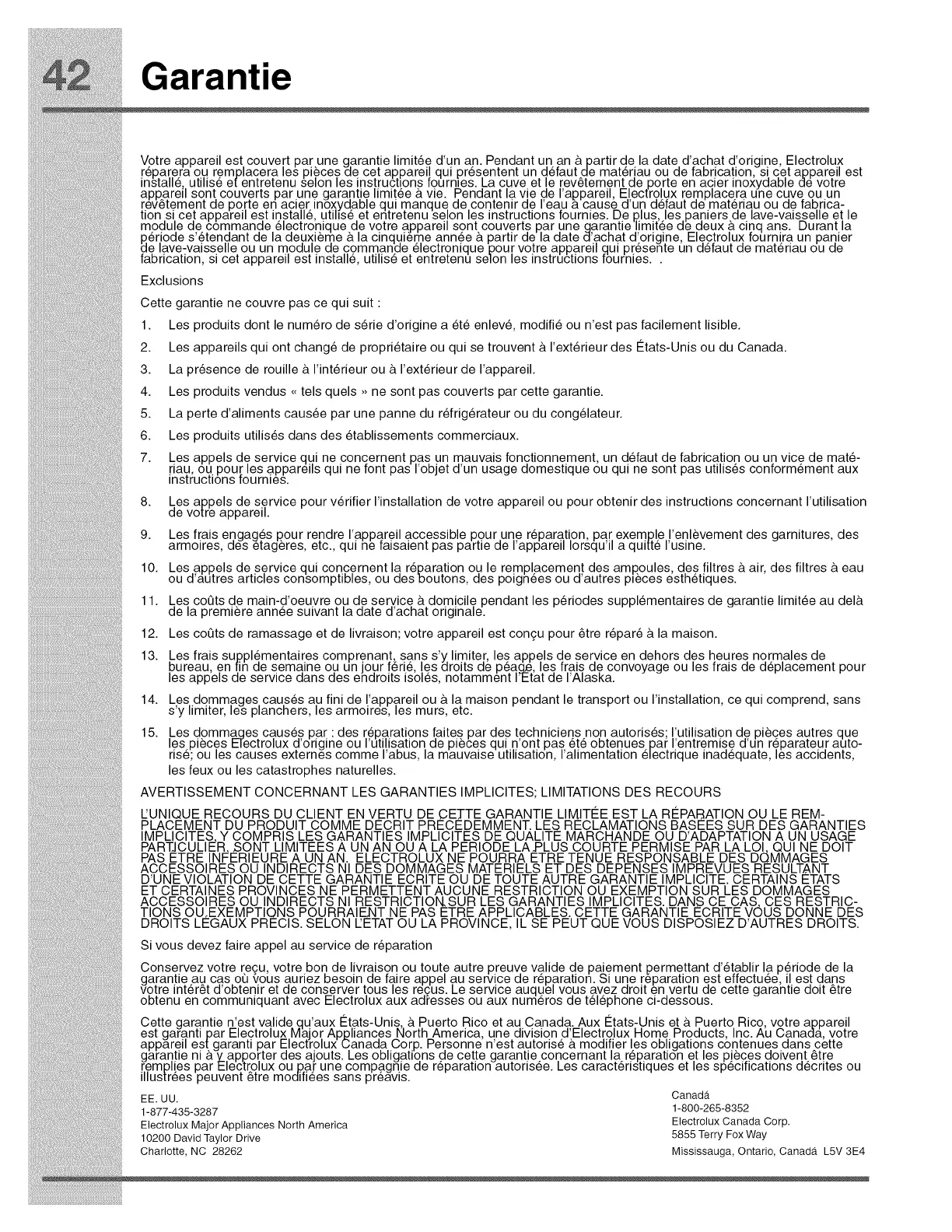 appareit es[garanti par Electrotux c,anaaa c,orp. _ersonne n'est autorise & moaiTier tes obligations contenues aans cette