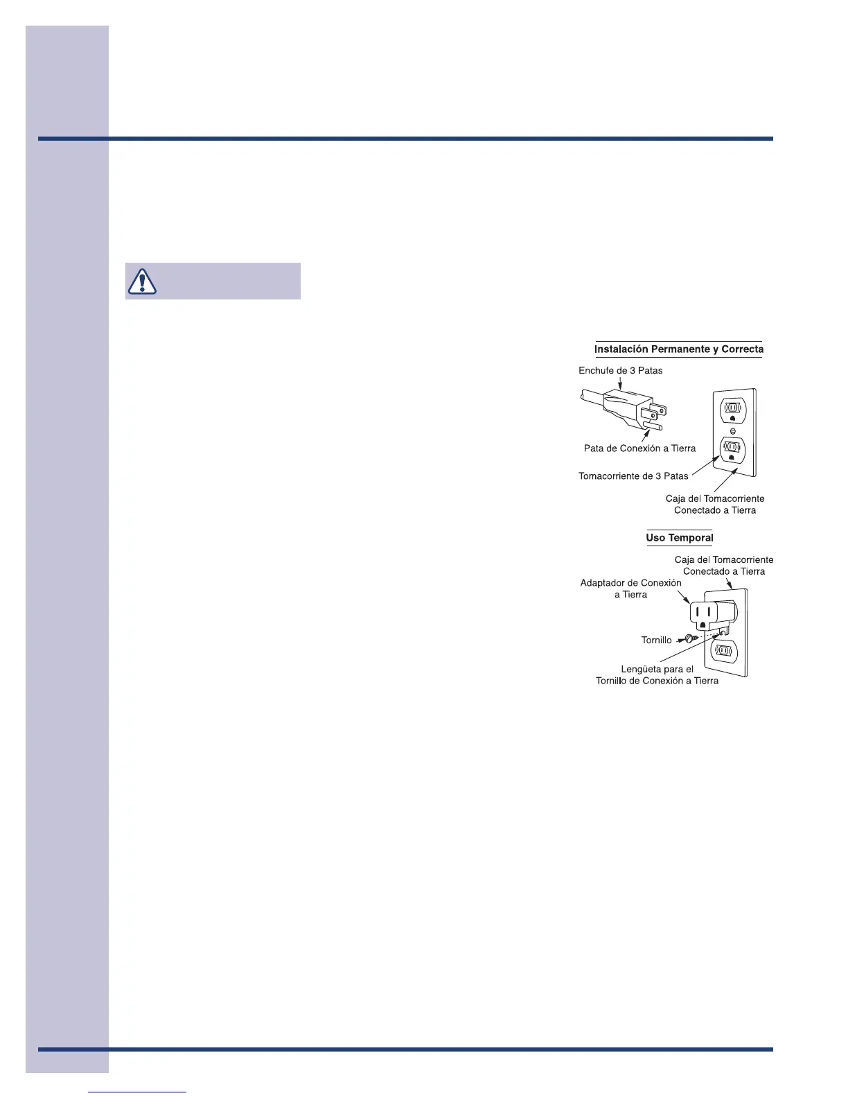 enchufe con toma a tierra. Éste se debe conectar en un tomacorriente de pared instalado y conectado a