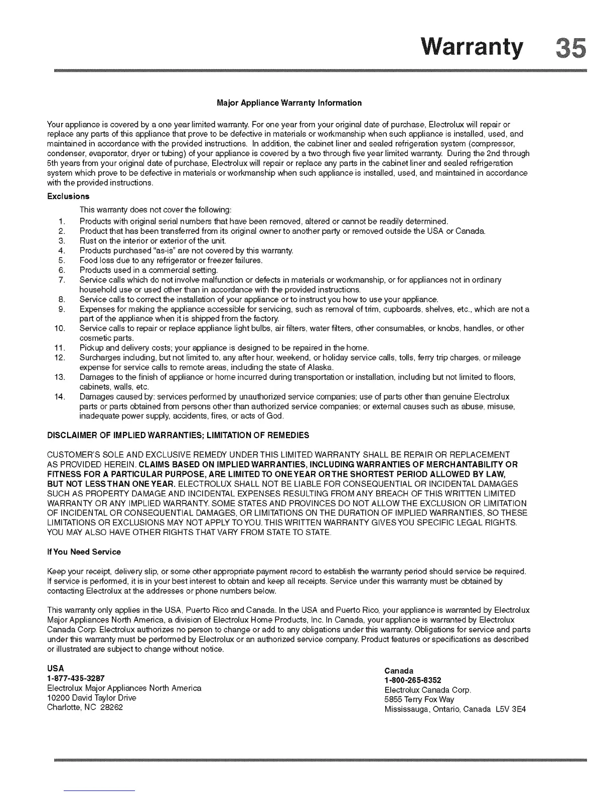 Major Appliances North America, a division of Electrolux Home Products, Inc. In Canada, your appliance is warranted by Electrolux