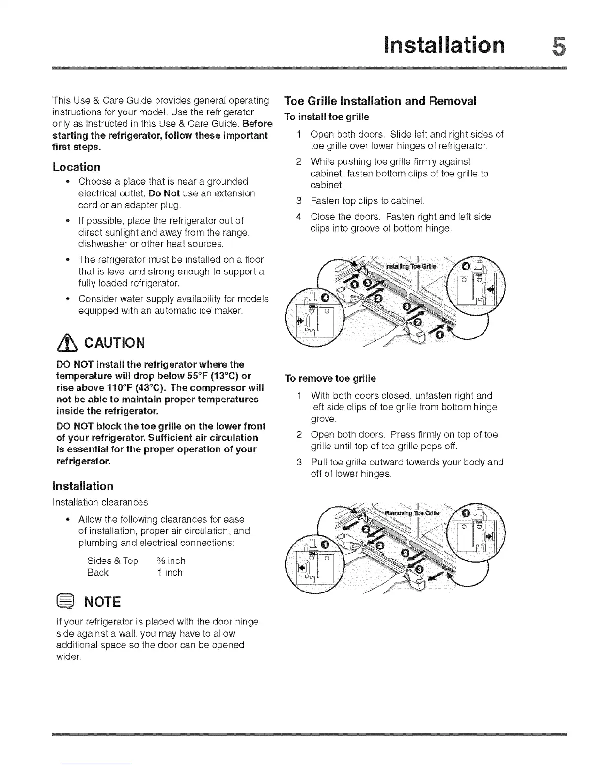toe grille over lower hinges of refrigerator.