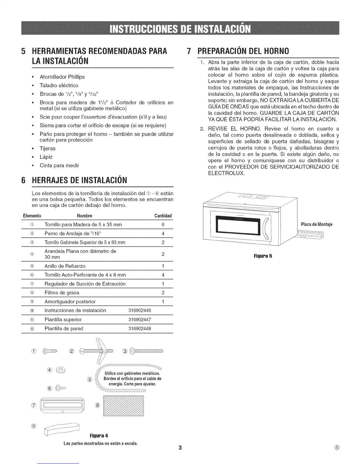 instalaci6n, la plantilla de pared, la bandeja giratoria y su