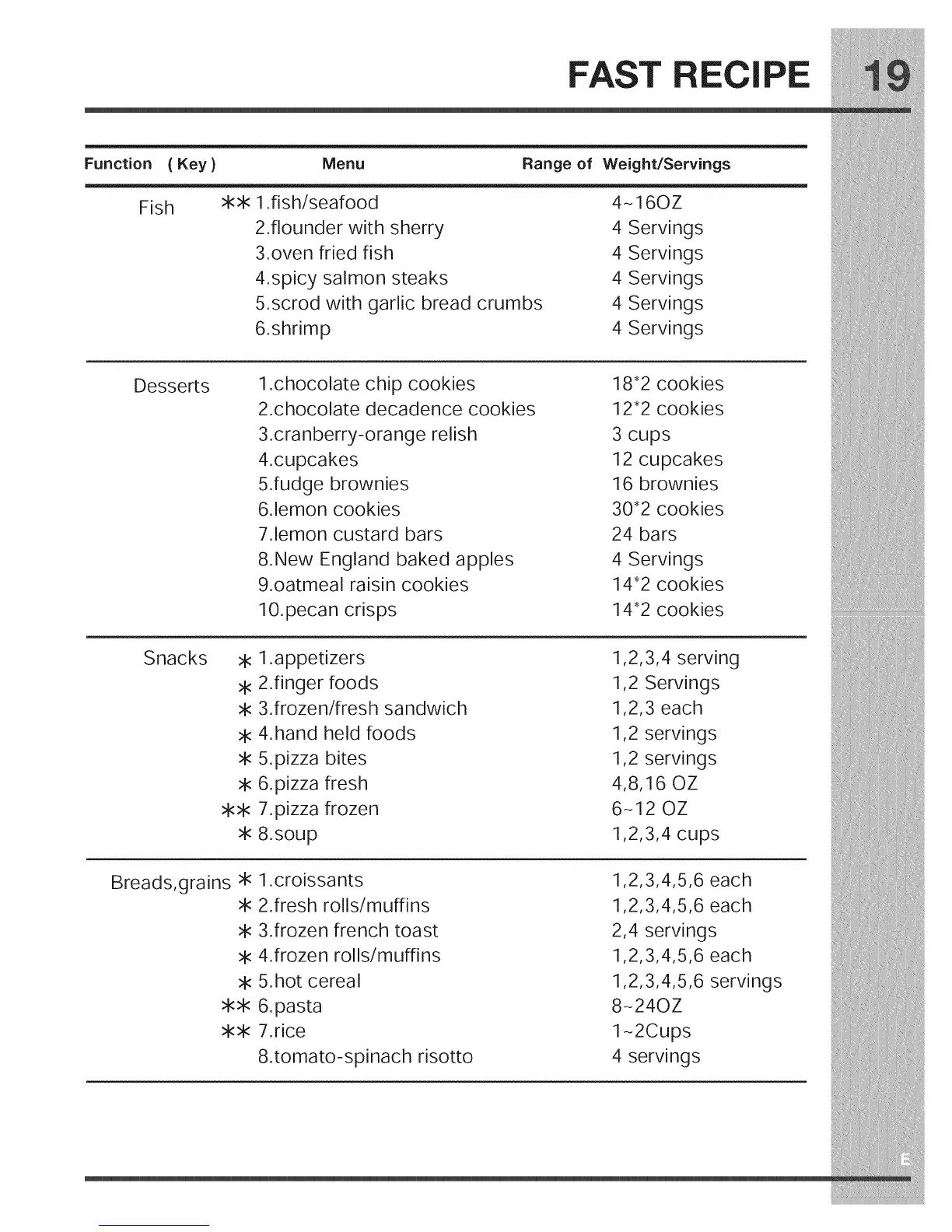 Function (Key) Menu Range of Weight/Servings