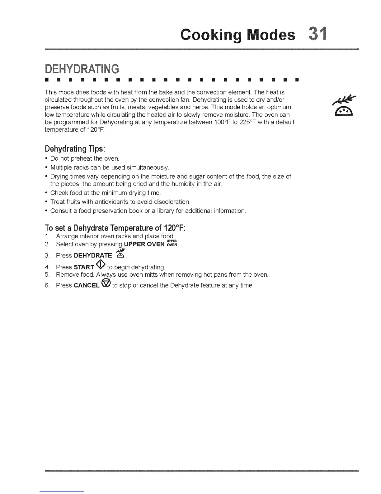 circulated throughout the oven by the convection fan. Dehydrating is used to dry and/or