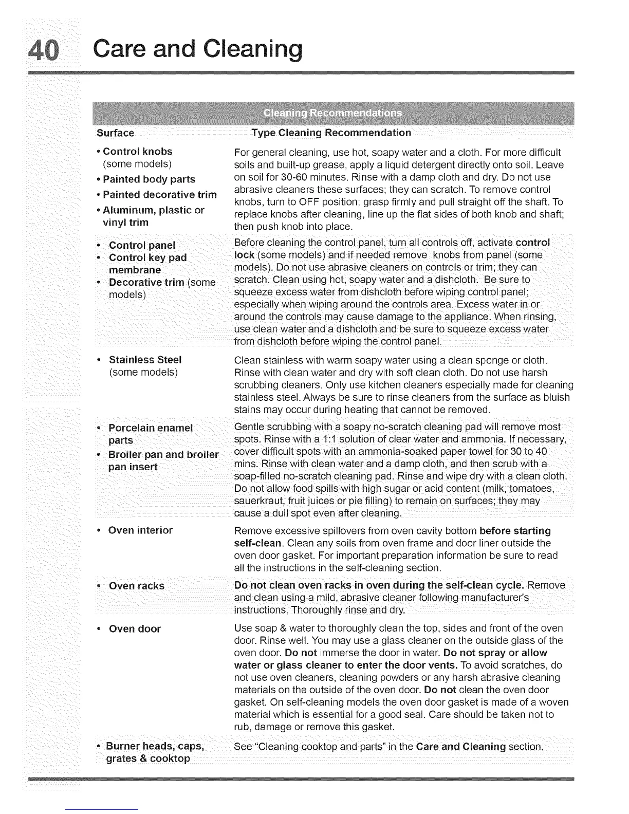 • Porcelain enamel Gentle scrubbing with a soapy no-scratch cleaning pad will remove most