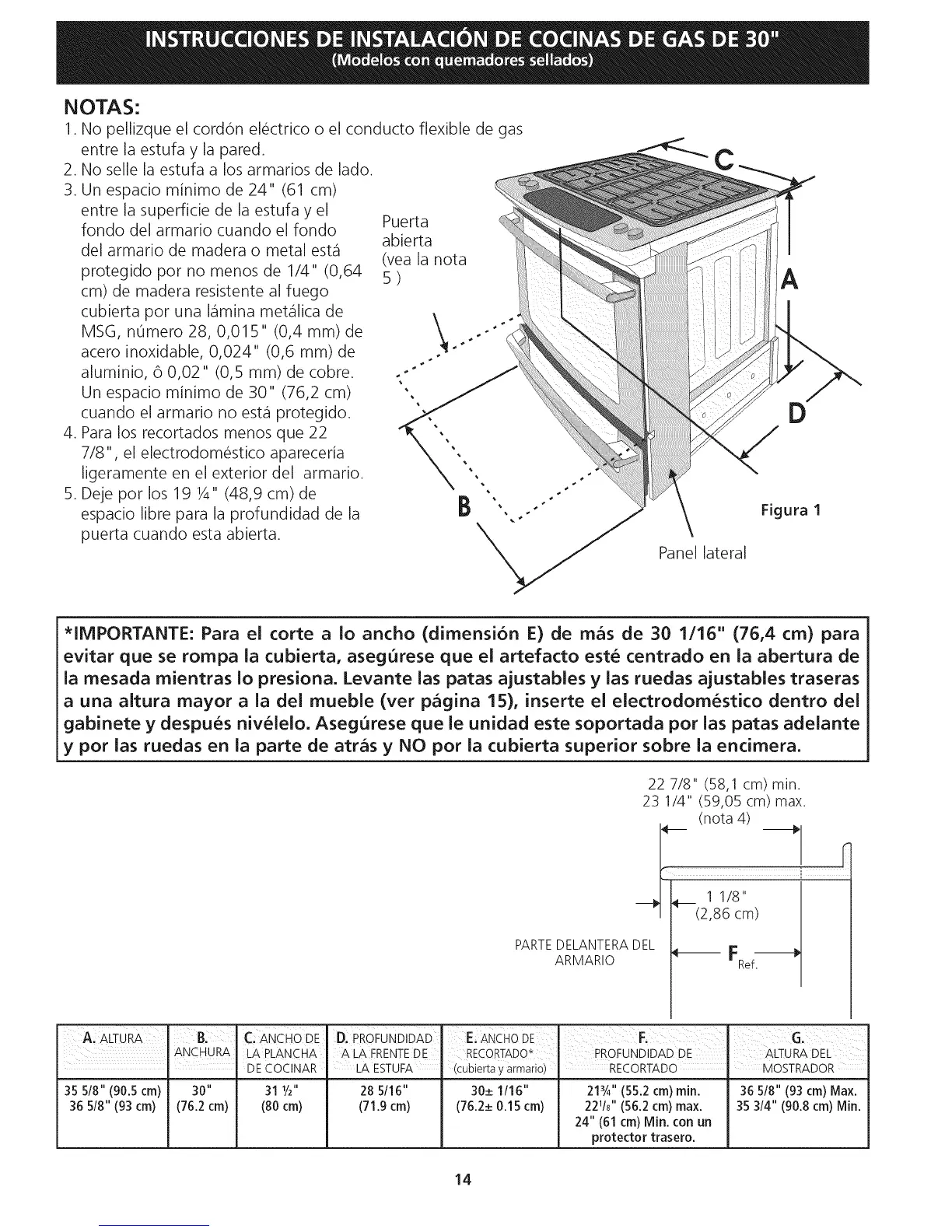*IMPORTANTE: Para el corte a io ancho (dimensi6n E) de mas de 30 1/16" (76,4 cm) para
