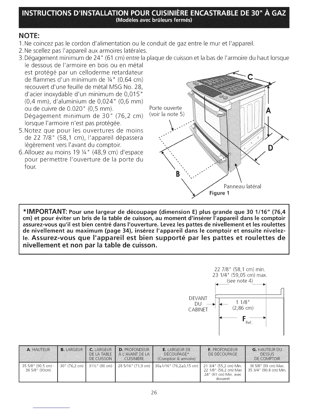 *IMPORTANT: Pour une largeur de decoupage (dimension E) plus grande que 30 1/16" (76,4