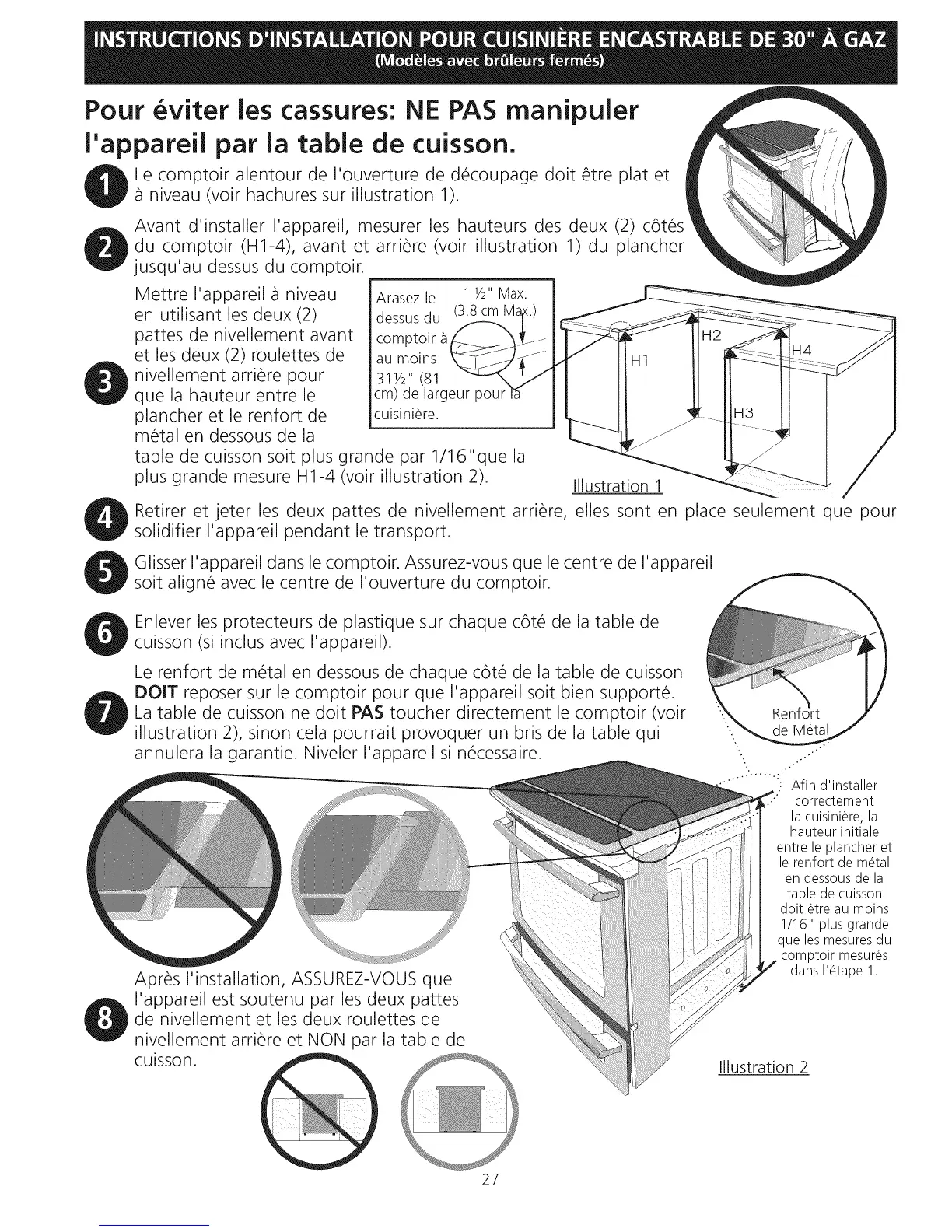 La table de cuisson ne dolt PA$ toucher directement le comptoir (volt