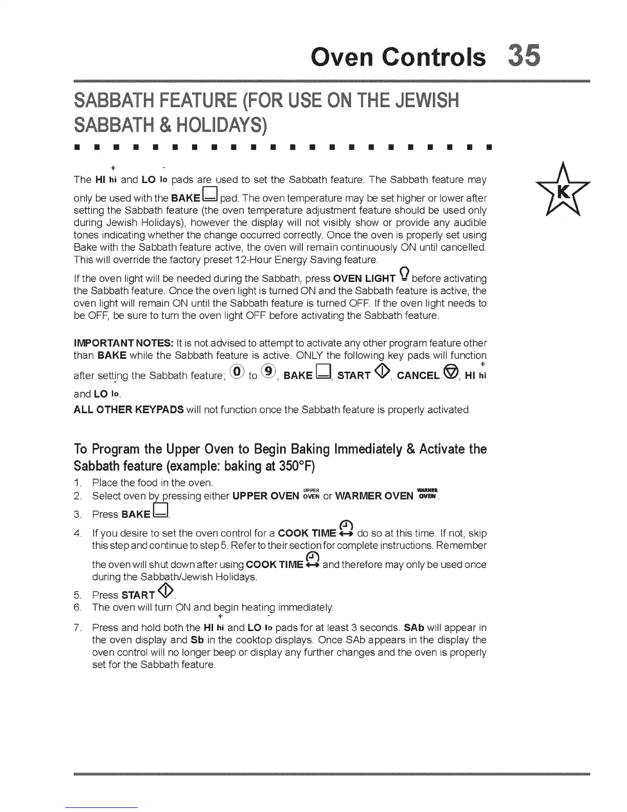 than BAKE while the Sabbath feature is active. ONLY the following key pads will function